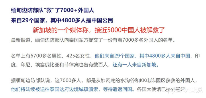 在中国、泰国、缅甸等国武装力量直接干预下,很多受苦的中国公民已经被解救了,目前没有查询到权威媒体汇总的信息,那这篇报道是几十,那篇报道是数百人,这么多天加起来,怎么也得几千吧。
